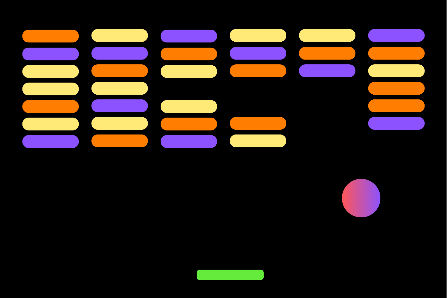 Una pelota rebota sin parar, y tu única tarea es evitar que caiga. Con una barra en la parte inferior, la controlas de un lado a otro, guiando cada rebote hacia los bloques que están arriba. Cada vez que la pelota toca un bloque, este desaparece al instante. El objetivo es simple: romperlos todos sin perder el control. Si la pelota se te escapa, el juego termina. Es un juego directo y fácil de jugar, pero mantener el ritmo requiere atención y buenos reflejos. Ideal para partidas rápidas y para quienes disfrutan los desafíos clásicos.